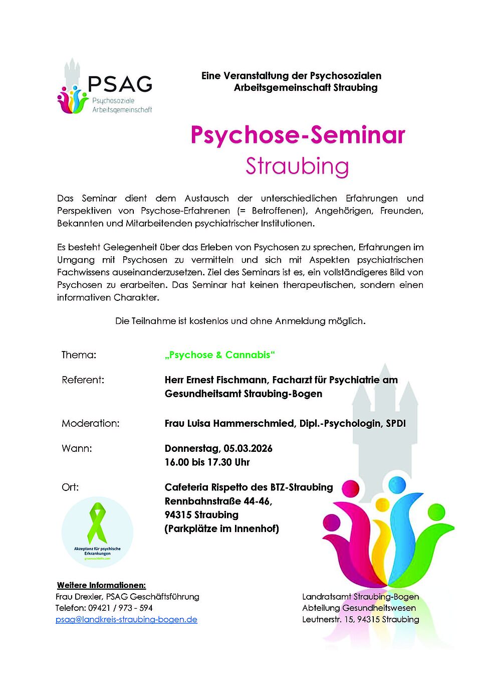 Das Seminar dient dem Austausch der unterschiedlichen Erfahrungen und Perspektiven von Psychose-Erfahrenen (= Betroffenen), Angehörigen, Freunden, Bekannten und MitarbeiterInnen psychiatrischer Institutionen. Es besteht Gelegenheit über das Erleben von Psychosen zu sprechen, Erfahrungen im Umgang mit Psychosen zu vermitteln und sich mit Aspekten psychiatrischen Fachwissens auseinanderzusetzen. Ziel des Seminars ist es, ein vollständigeres Bild von Psychosen zu erarbeiten. Das Seminar hat keinen therapeutischen, sondern einen informativen Charakter.